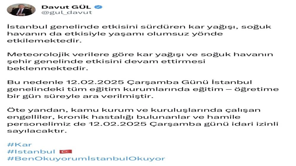İstanbul Valisi Davut Gül, "Çarşamba günü İstanbul genelindeki tüm eğitim kurumlarında eğitim-öğretime 1 gün süreyle ara verilmiştir" dedi.İstanbul Valisi Davut Gül tarafından yapılan açıklamada, "İstanbul genelinde etkisini sürdüren kar yağışı, soğuk havanın da etkisiyle yaşamı olumsuz yönde etkilemektedir. Meteorolojik verilere göre kar yağışı ve soğuk havanın şehir genelinde etkisini devam ettirmesi beklenmektedir. Bu nedenle 12 Şubat 2025 Çarşamba Günü İstanbul genelindeki tüm eğitim kurumlarında eğitim-öğretime 1 gün süreyle ara verilmiştir. Öte yandan, kamu kurum ve kuruluşlarında çalışan engelliler, kronik hastalığı bulunanlar ve hamile personelimiz de 12 Şubat 2025 Çarşamba günü idari izinli sayılacaktır" ifadelerine yer verildi.